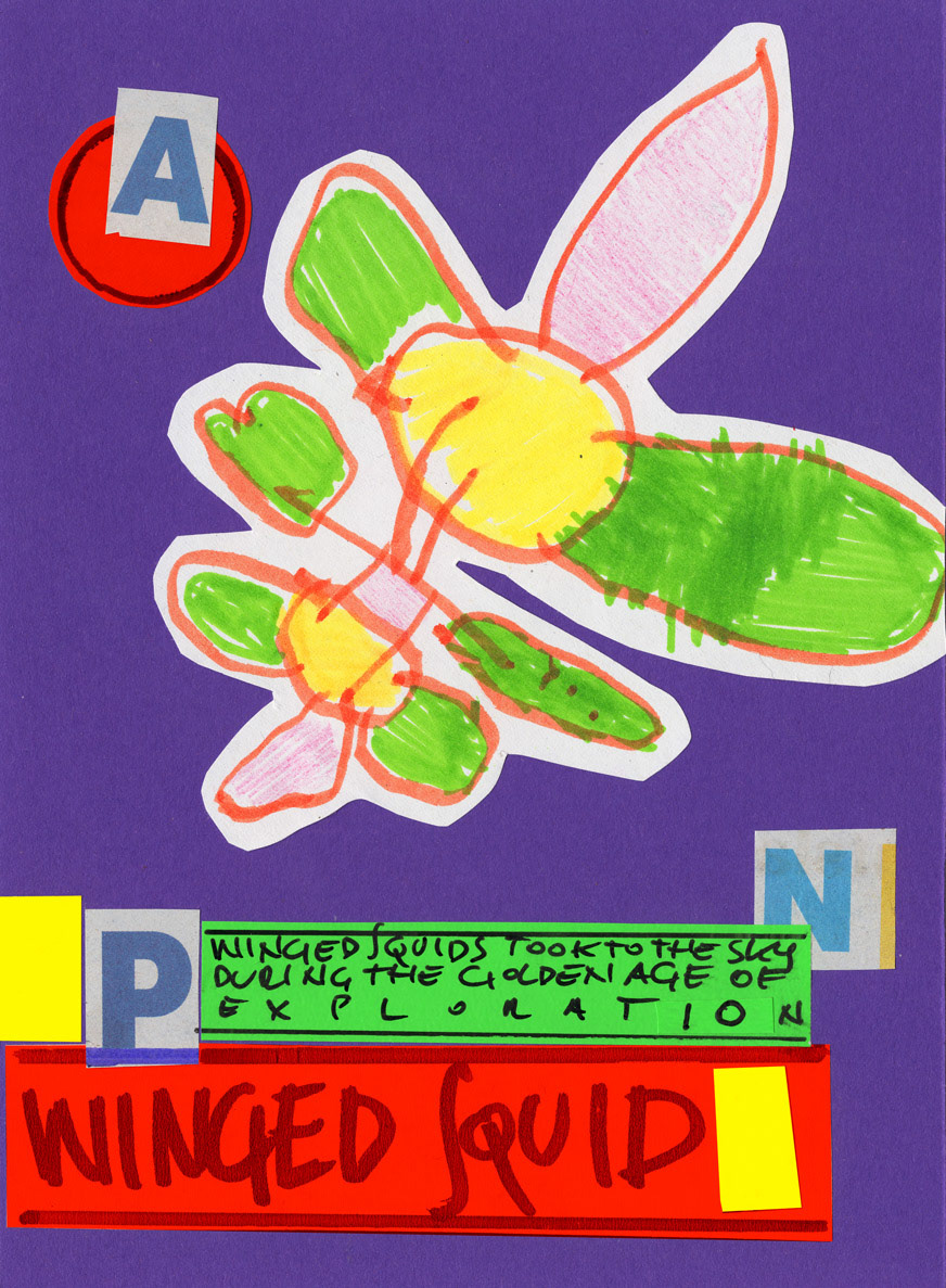 This work is a part of the Project E&T series. Project E&T is a collaboration between my 5-year-old son Elliott and me: he provides the passionate scribblings, and I cut them up, create collages, and add absurdist poetry.
