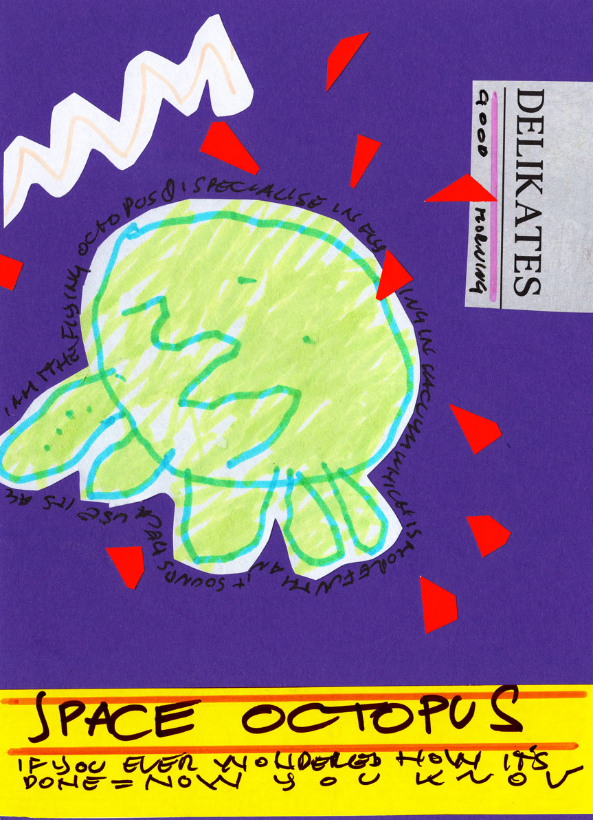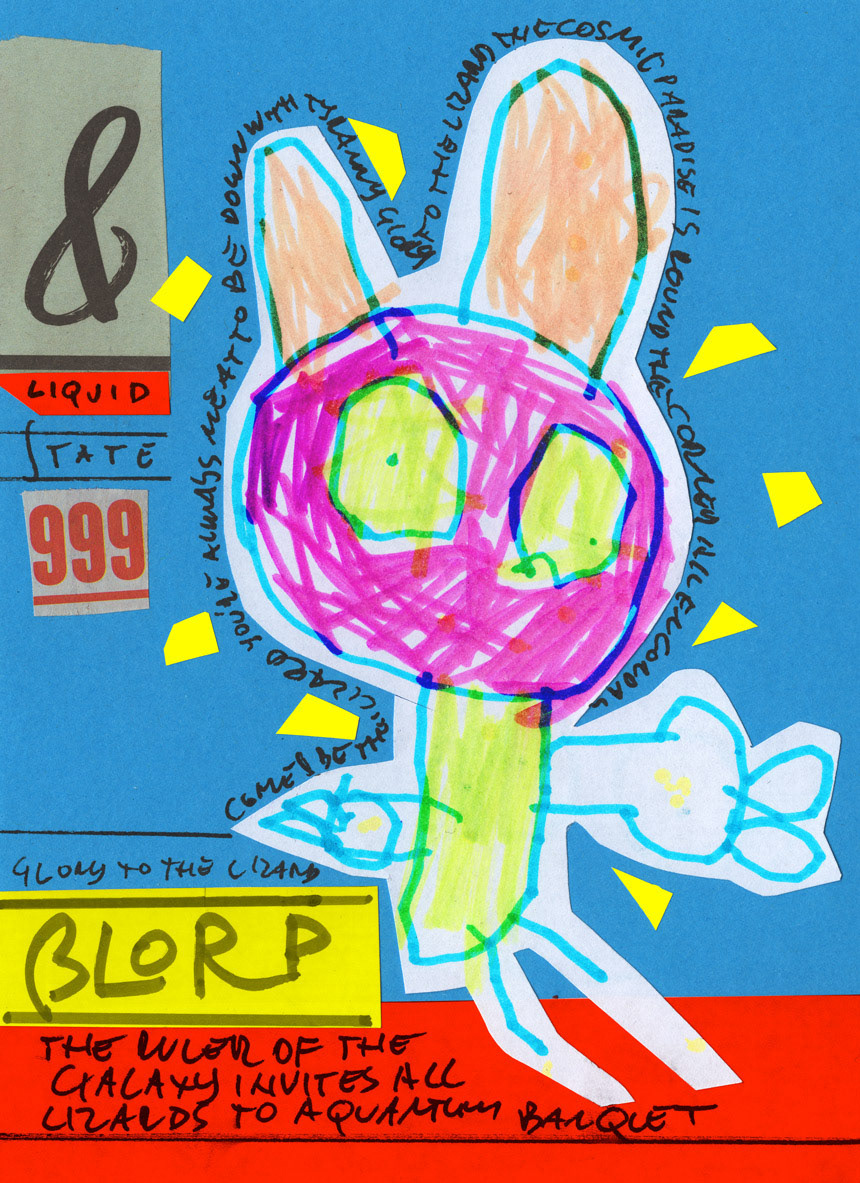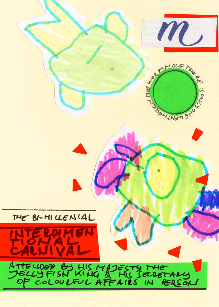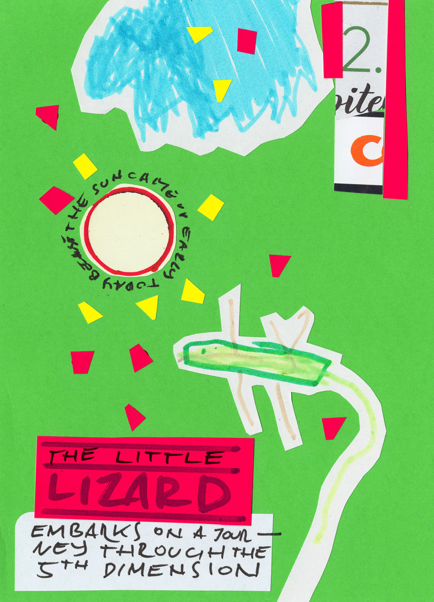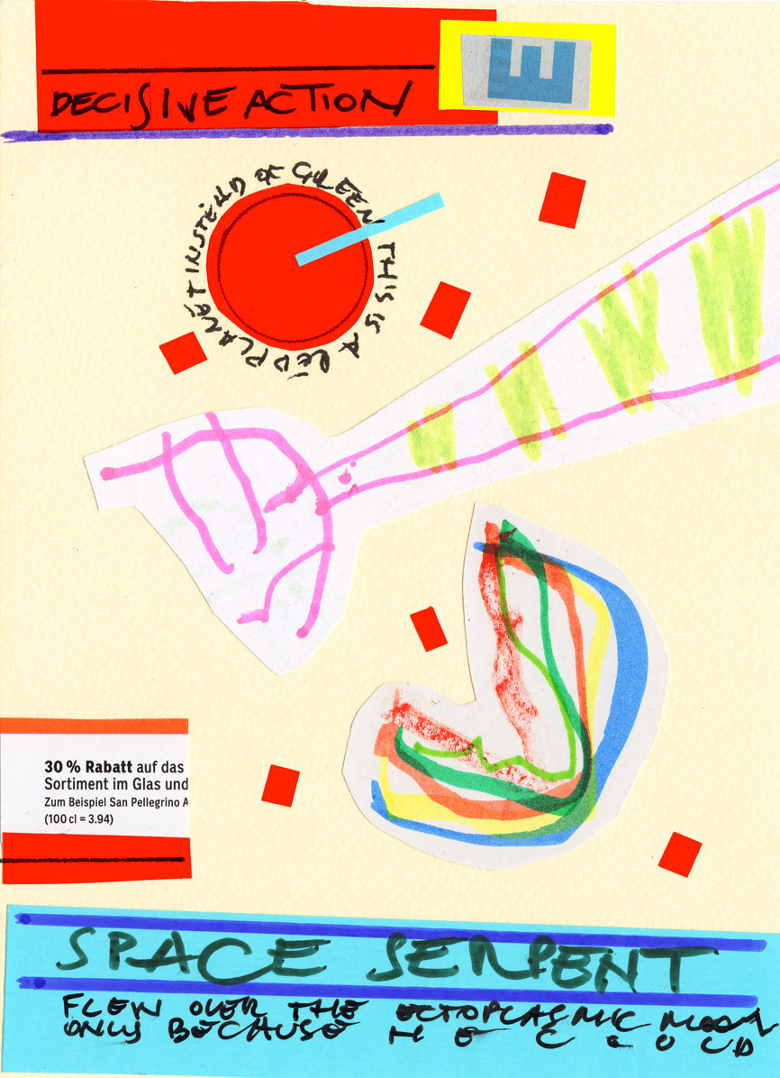 This work is a part of the Project E&T series. Project E&T is a collaboration between my 5-year-old son Elliott and me: he provides the passionate scribblings, and I cut them up, create collages, and add absurdist poetry.