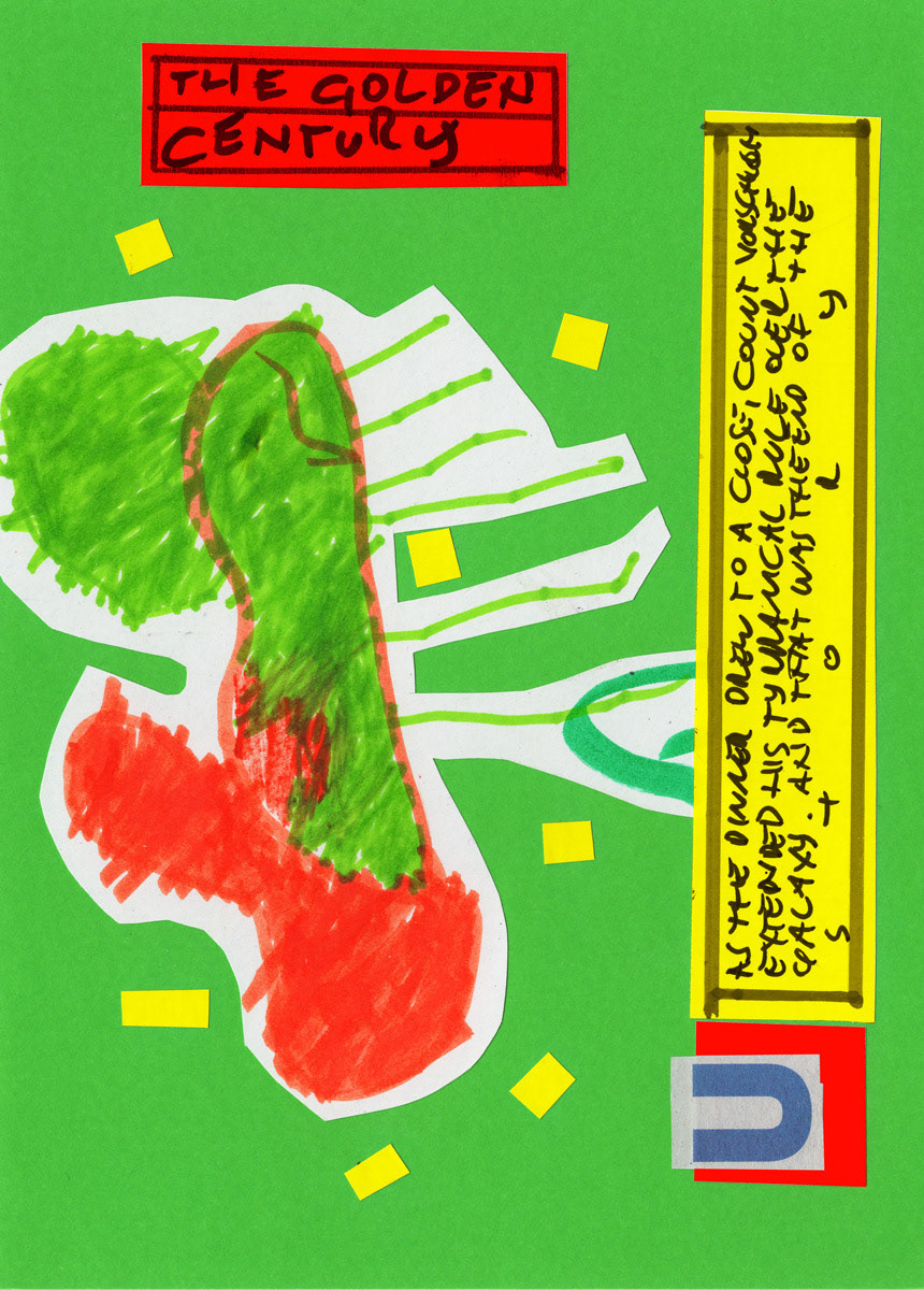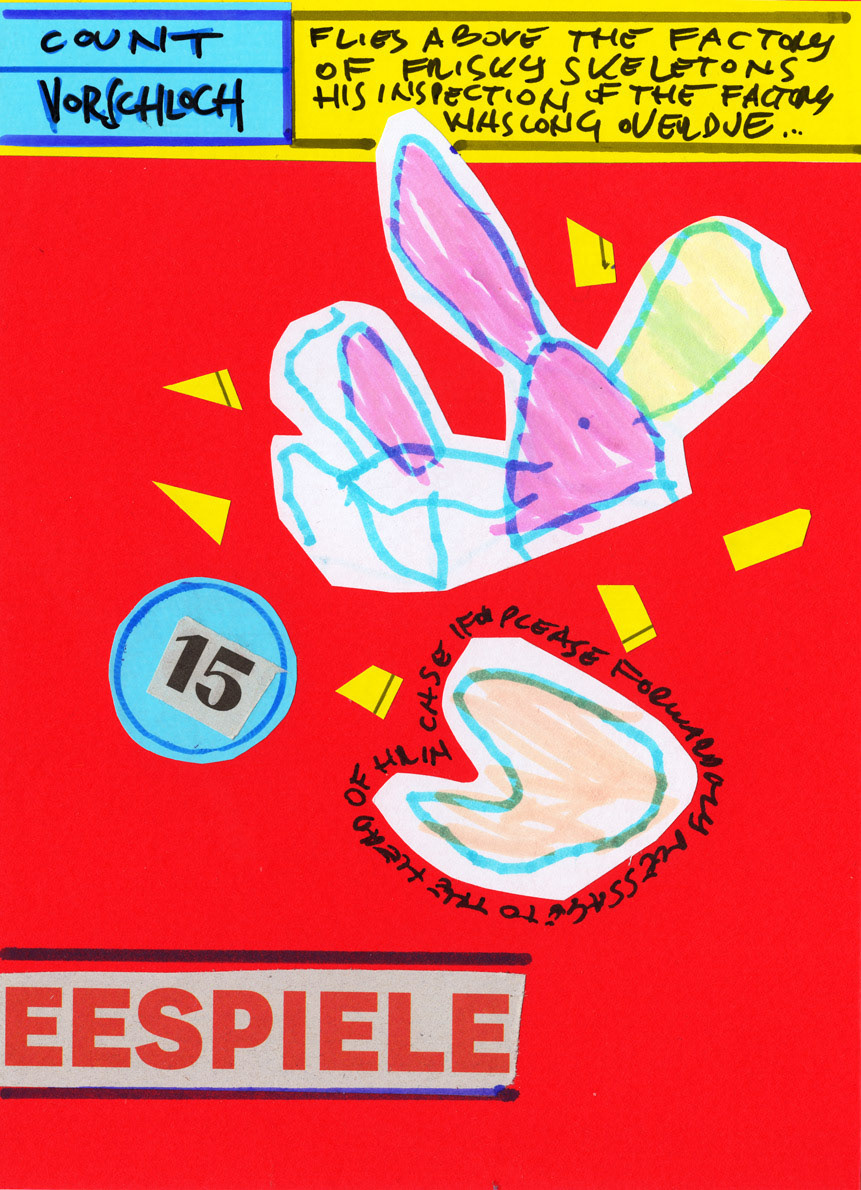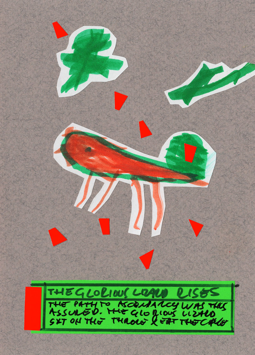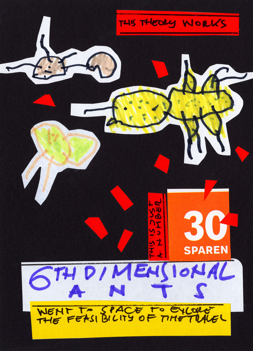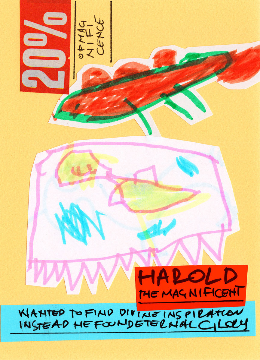 This work is a part of the Project E&T series. Project E&T is a collaboration between my 5-year-old son Elliott and me: he provides the passionate scribblings, and I cut them up, create collages, and add absurdist poetry.